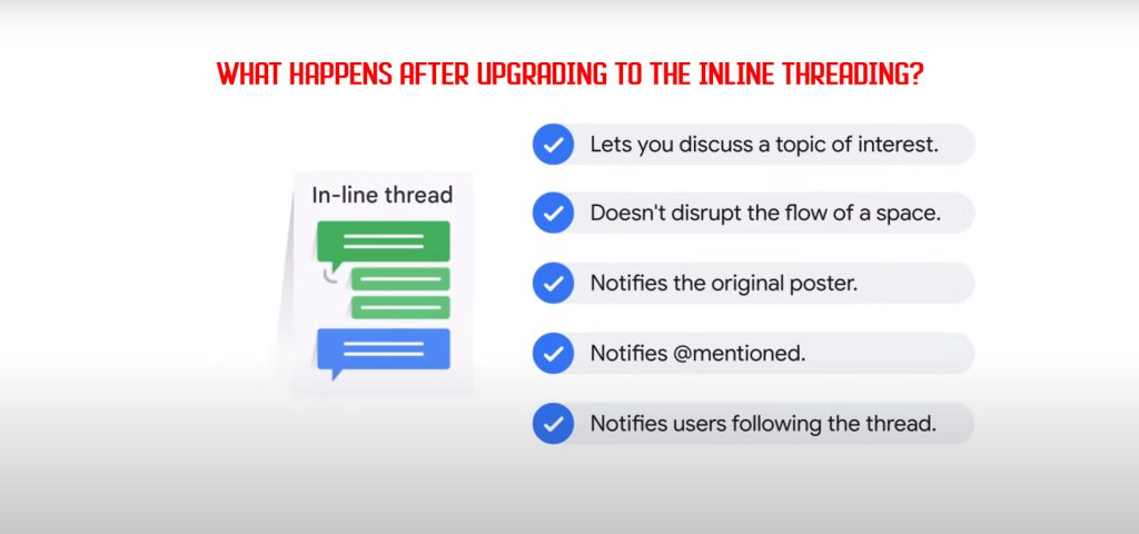 Google chat in-line threading will be the standard for all new spaces. “Organize the conversation by topic” will not be shown in the space. The Existing spaces organized by conversation topic will continue to function as they do today. If you need to check updates relating to Google chats and spaces check here.