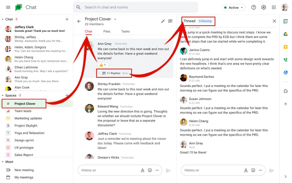 One can reply to any message and create a separate discussion separated from a main conversation. This is helpful when one wants to reply to a specific message or wants to discuss a topic in-depth with a disturbing follow of the main conversation. The inline threading makes things easier for people to Scan and understand what’s being discussed in the space, Browse all topics via the active thread navigation panel, and Find & follow the most relevant topics and conversations in chat.
