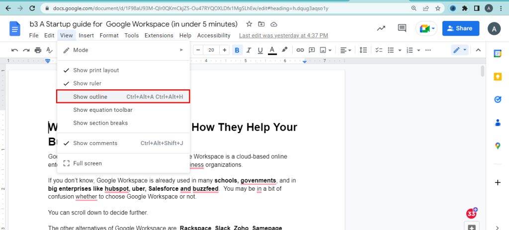 Organizing documents is important in word processing. Use google docs to create, and edit the text document using the web browser. Many people collaborate at the same time. The changes are saved in the cloud automatically. Your document is structured using the outlines in google docs. The outline option detects the title and heading from the text written. Google docs automatically add headings to the outline.