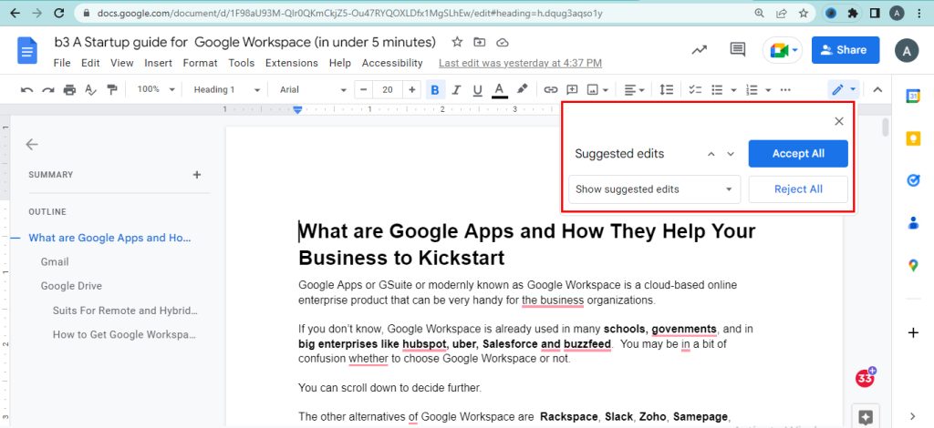 Suggestion mode enables one to suggest changes in a document. The changes suggested to the document are not immediately applied. After the approval of the owner, the suggested edits are applied.