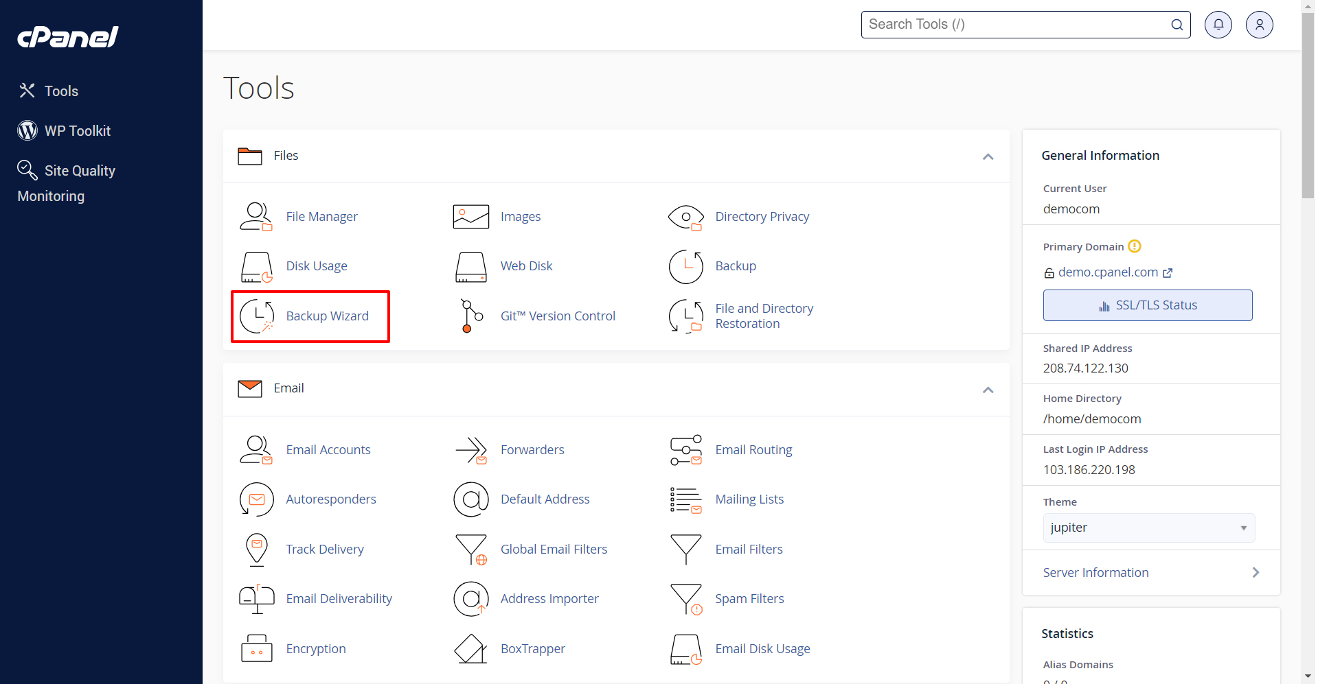 • Go to the Files sections and click Backup Wizard.