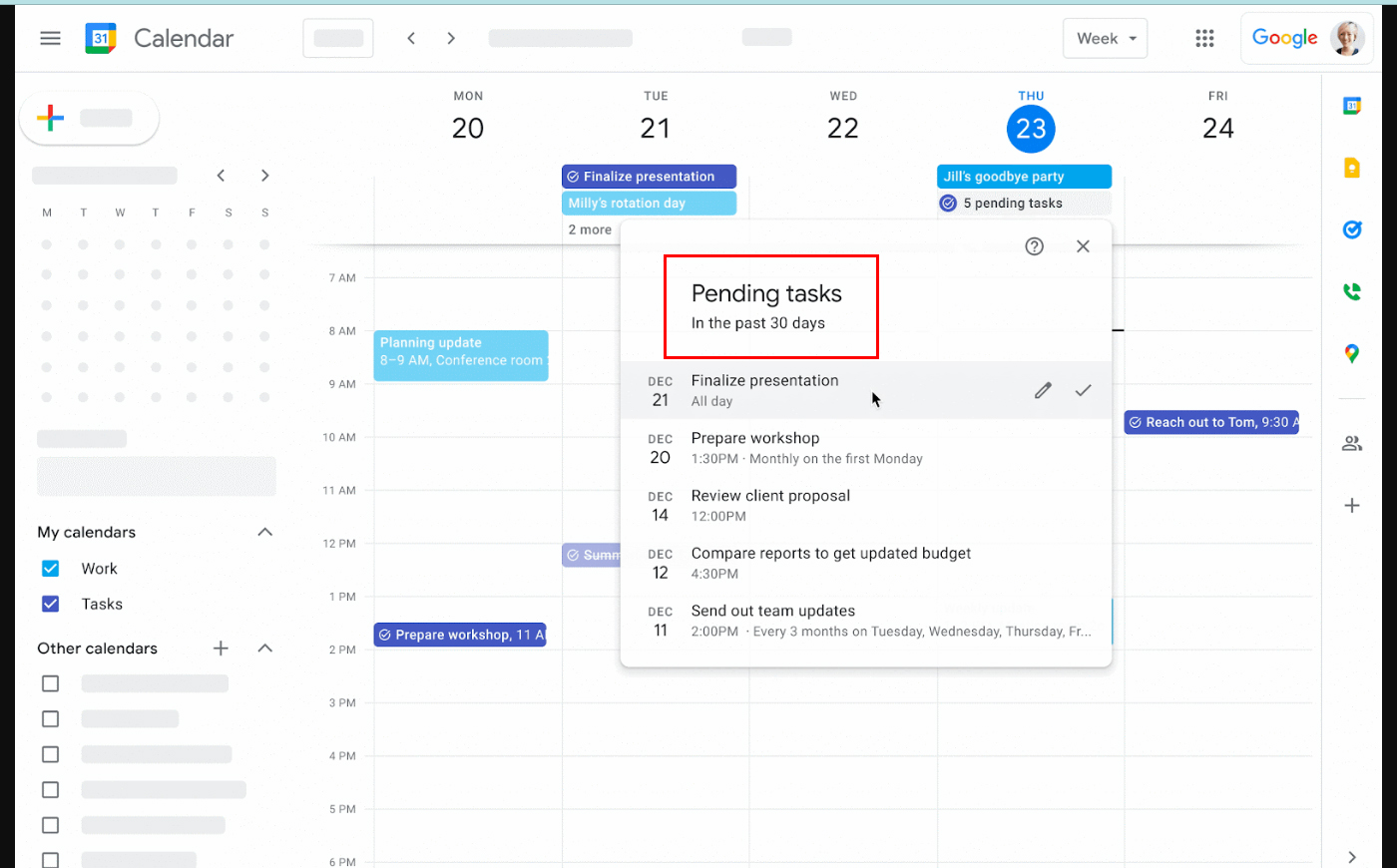 Google Calendar helps to schedule meetings and create tasks. You leave some of the tasks when working. Using a calendar creates reminders about your meetings and tasks. It is difficult to find a missing task. Google Calendar manages your pending tasks. If you have a pending task, due in the last 30 days. Enter information about a pending task by clicking a task, you will see a list of pending tasks. If you completed the task you mark it as completed in the list.