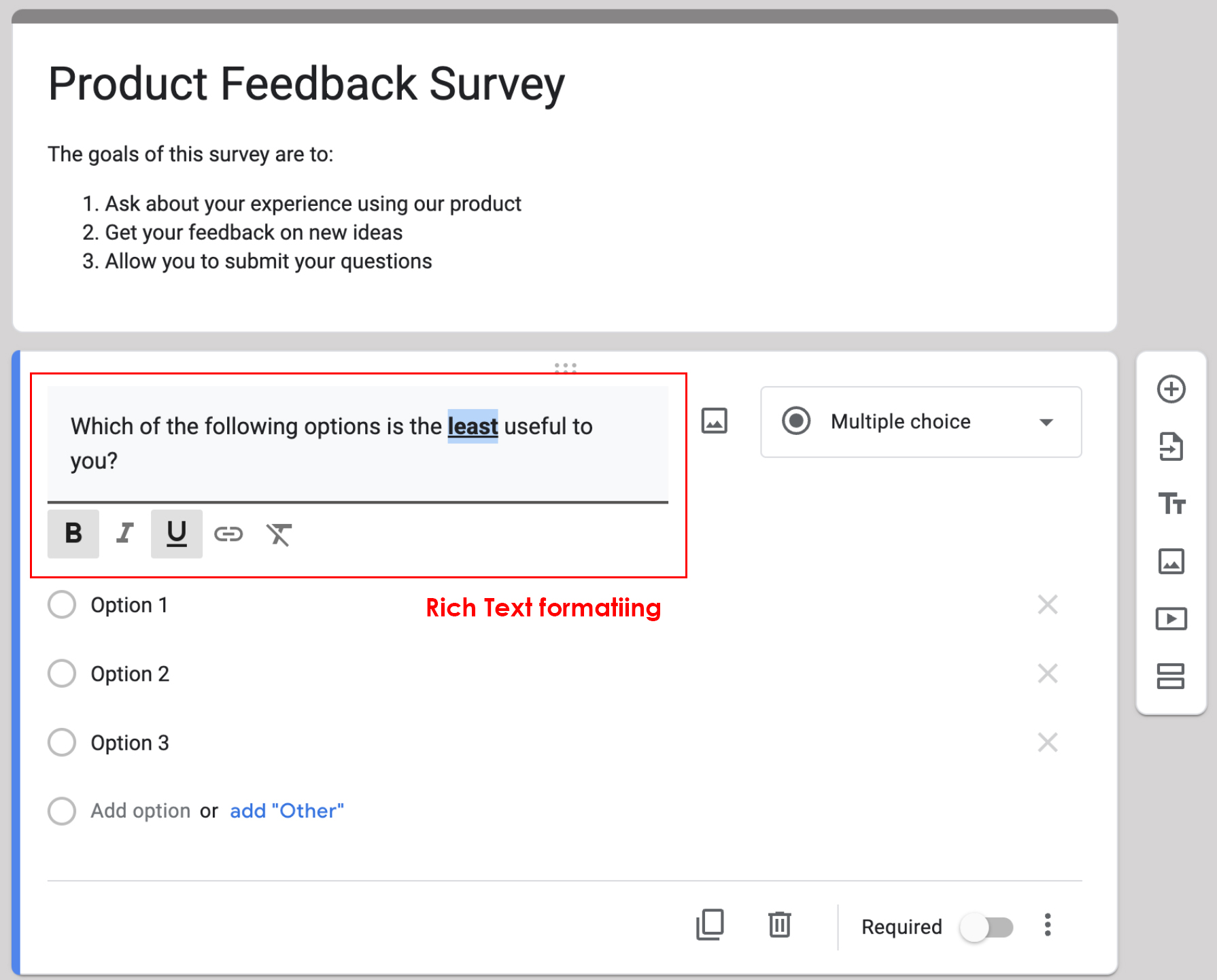 Workspace released updates for rich text formatting in Google Forms. Google Forms are used to fill in the forms and surveys to analyze responses online. Google Forms allows users to customize forms. Using this option users can bold, italicize, hyperlink, and list in titles, question titles, and descriptions.