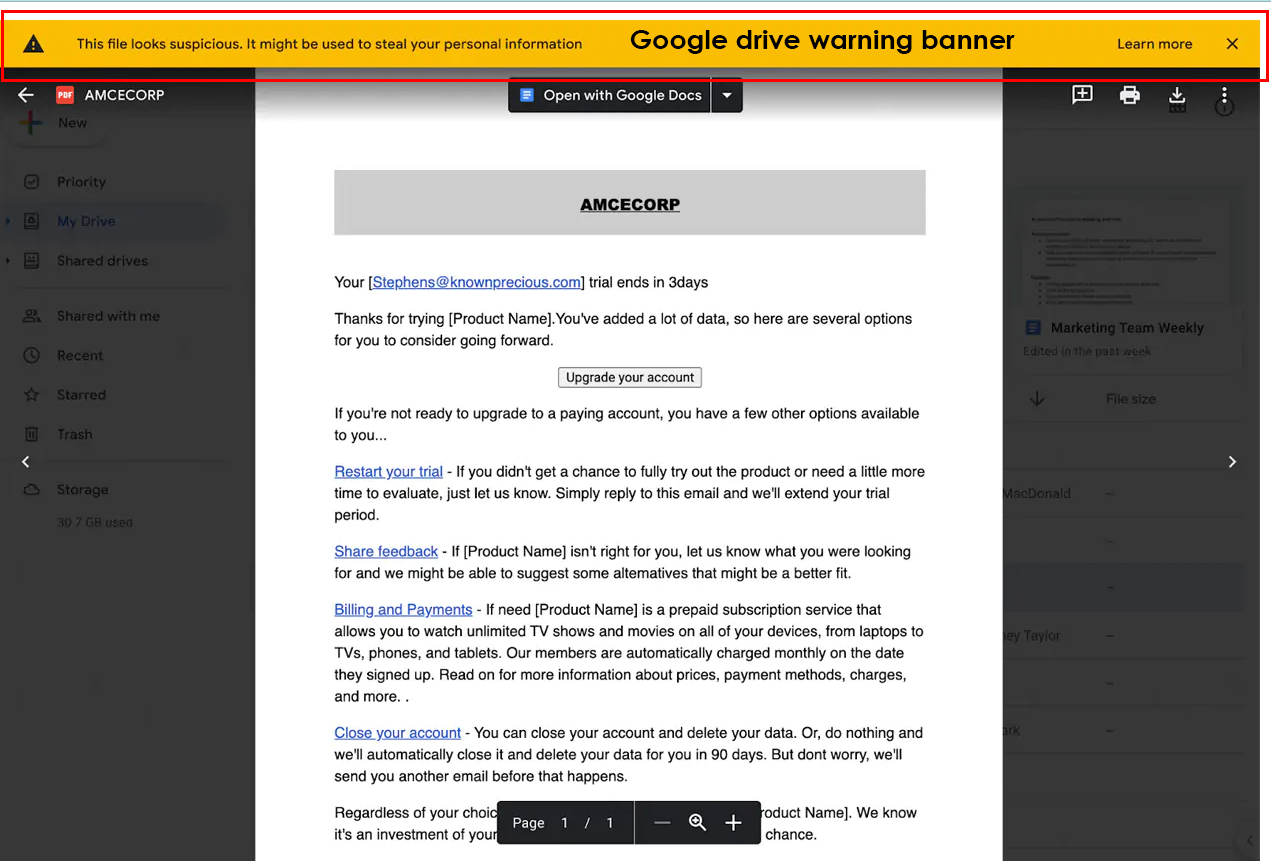 People work with many office files. Google Drive file is shared with colleagues. If files have a virus in their system, their files are affected. When they share with others, the virus affects the files. Already Google Docs, sheets, slides, and drawings display warning banners to the users. when opening potentially harmful files, Google Drive displays a warning banner if the user opens a suspicious file in Google Drive.