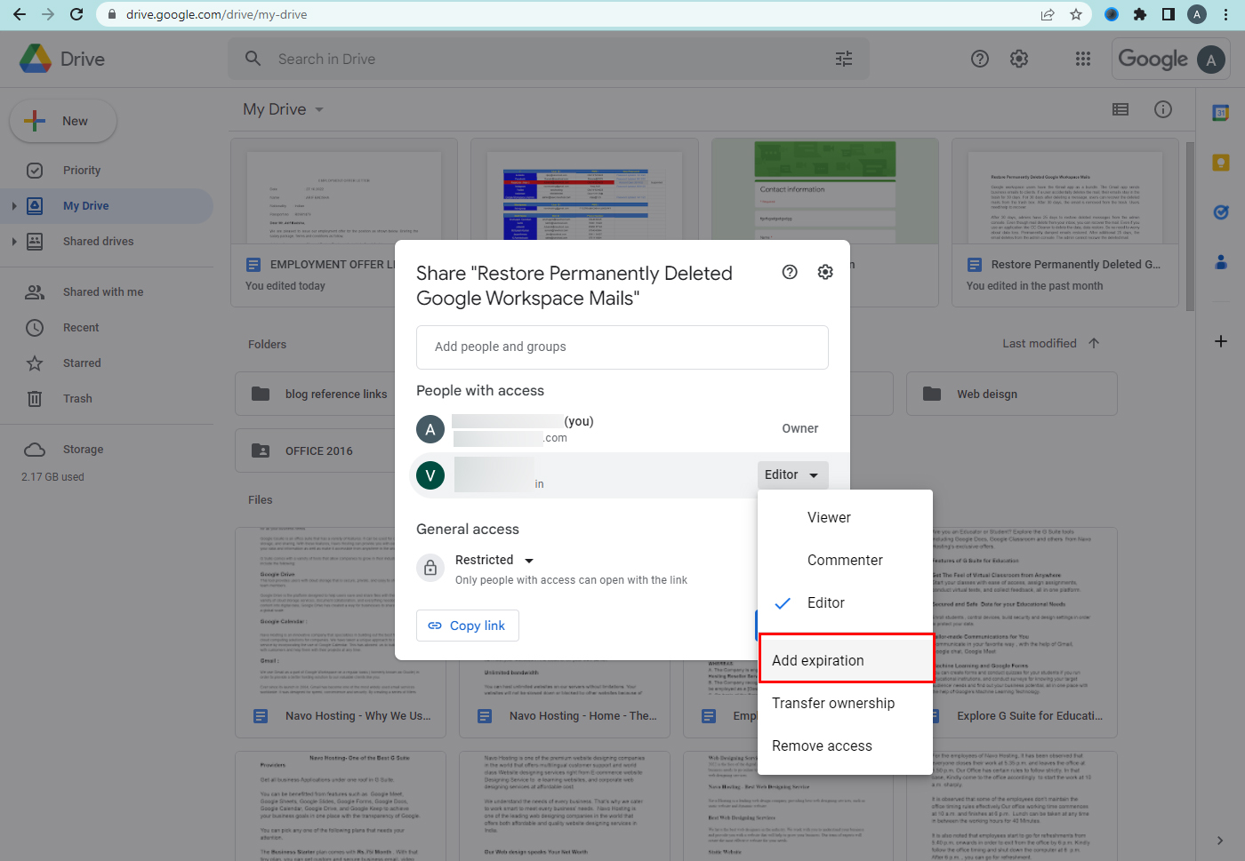 When working with people outside your organization, you can restrict the content from their access in Google Drive. After finishing your project, you want to restrict access to some files. You can also set the expiration date to limit the access and end access to a file in Google Drive. The steps to add an expiration date are given here.